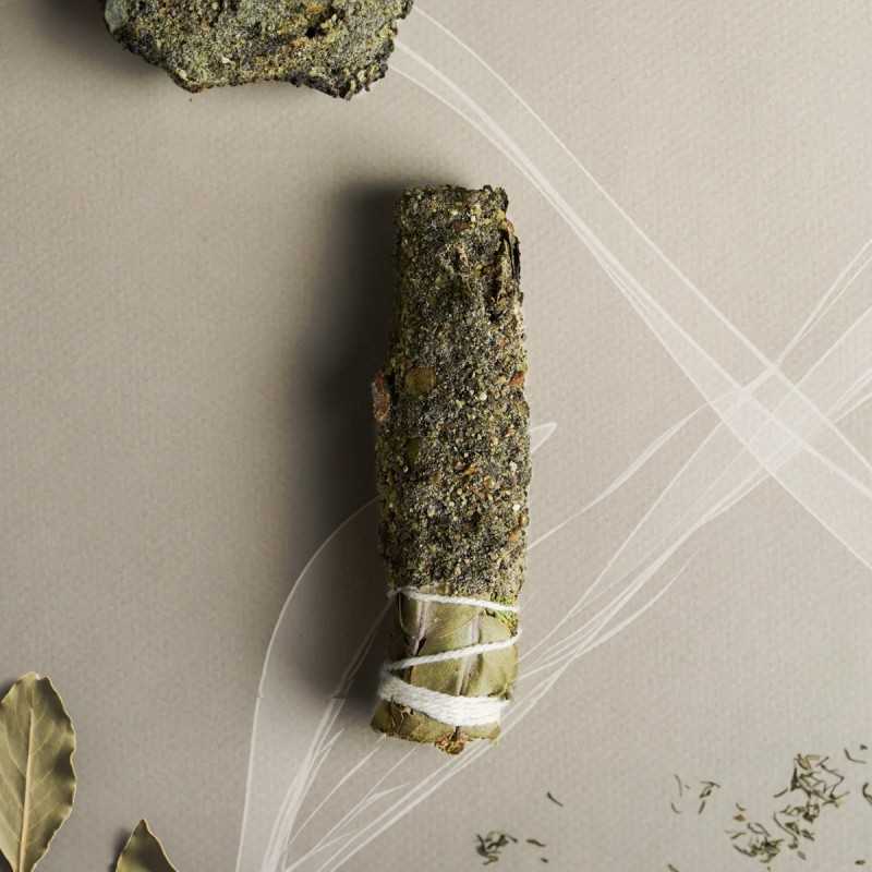 Maak kennis met een ambachtelijk vervaardigde, zuiverende en beschermende wierook smudge stick, gemaakt met copal-hars, laurierbladeren, eucalyptus en ceder. Deze krachtige wierookstok geeft een warme, kruidige, aardse en subtiel zoete geur af. De combinatie van natuurlijke ingrediënten vormt een krachtig instrument om de helderheid te verbeteren, de creativiteit te stimuleren en ruimtes te zuiveren van ongewenste energieën.