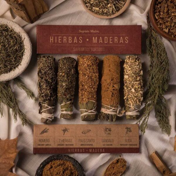 Ervaar de harmonieuze werking van 5 verschillende Smudge Sticks, elk uniek en handgemaakt uit verschillende elementen, waaronder rozemarijn, een mix van 7 kruiden, palo santo, sandelhout en wijnruit. Deze smudge sticks geven een warme, kruidige en aromatische geur af, met een vleugje pikante hars die een sfeer van rust en kalmte creëert. Hun geur, een harmonieuze mix van kruidige en houtachtige noten, roept een gevoel van gronding en bescherming op.