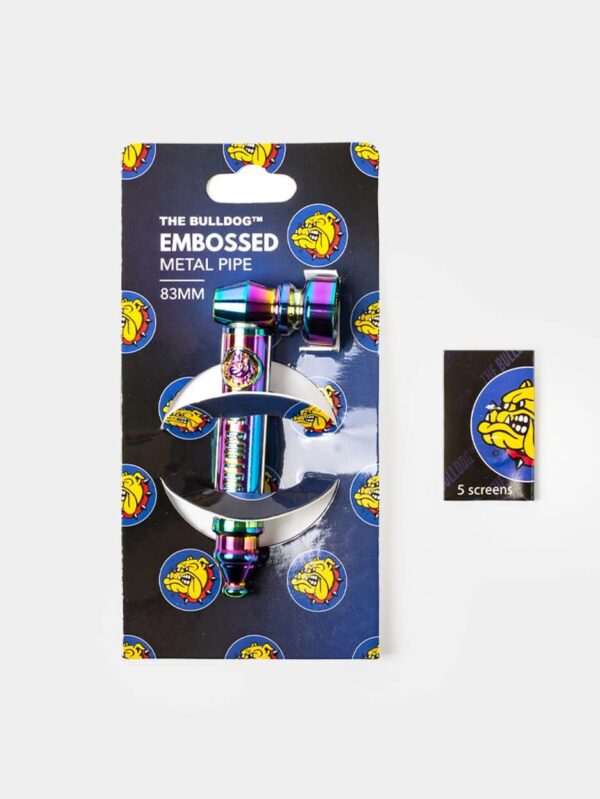 The Bulldog Metal Pipe Set Rainbow. Stijlvolle metalen pijp met reliëf en The Bulldog-logo. Extra screens zijn inbegrepen.